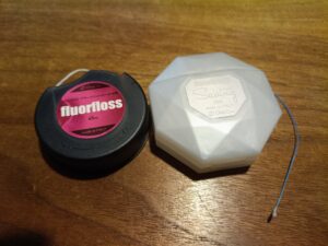 デンタルフロスはロール上に巻かれた化学繊維の束を適当な長さに切って使います。